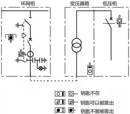如圖7所示,環網柜內部,隔離/接地開關與電纜室門之間的鑰匙聯鎖,電纜室蓋板打開后,鑰匙被鎖定,不能拔出插入到隔離開關鎖,即不能操作接地開關;只有蓋板合上,鑰匙才能拔出,去操作接地開關分閘。而系統角度,只有接地開關合閘,鑰匙才能被取出,去開變壓器箱的門,實現變壓器檢修,同時低壓斷路器不能合閘。