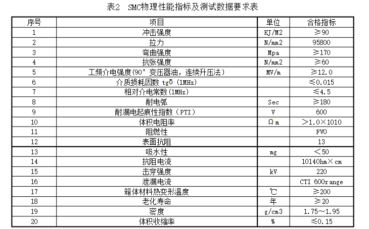 2.3.1分支箱外殼選用S304不銹鋼材料,箱體、門體材料厚度均不該小于2毫米,或SMC復合材料箱體,SMC物理功能指標及測試數據滿意表2的要求。