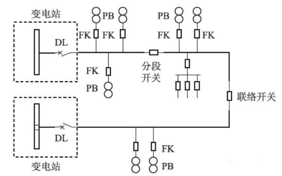 如下圖所示,其作為現階段典型的配電系統拓撲圖,變電站的10kV出線配置斷路器和對應保護,主線路中引用開關分段,各分支線路結合負荷開關的方式進行配置,且全部開關都具有合閘等功能。因為分段開關與負荷開關在運行期間,難以斷開短路電流,所以不需要安裝保護設施。其中,圖中的DL屬于斷路器,FK屬于負荷開關,而PB是配變。