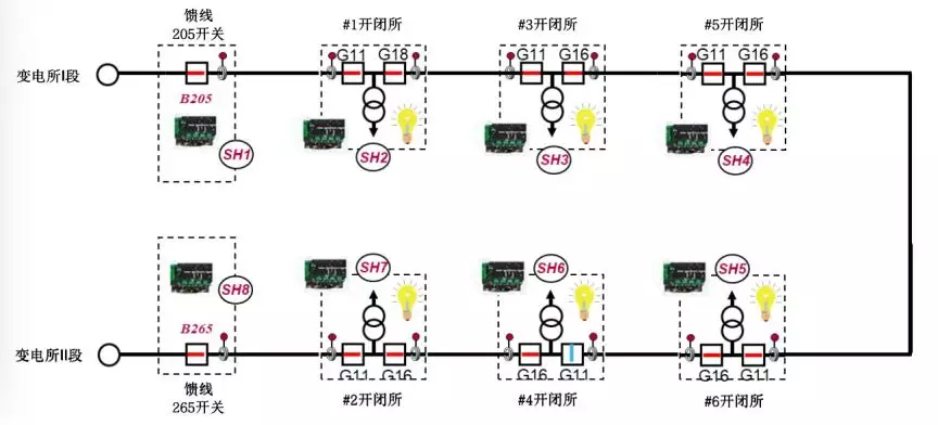 而通過在環(huán)網(wǎng)進線負荷開關柜布置T300的自愈方式,將能夠實現(xiàn)更低成本的環(huán)網(wǎng)自愈。具體而言,在機場飛行區(qū)供電網(wǎng)絡建設中,變電站兩路出線帶若干個開閉所組成一個環(huán),變電站外出線隔離站及每個環(huán)網(wǎng)站節(jié)點各配置一臺T300裝置,以對等通訊方式實現(xiàn)故障區(qū)段自動定位故障區(qū)段自動隔離非故障區(qū)段自動恢復供電,使供電網(wǎng)絡故障實現(xiàn)全自動化快速處理,約30秒內實現(xiàn)故障的快速切除以及恢復送電,達到世界一流的配電自動化水平。