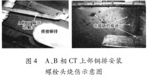 斷路器氣室內部PT隔離開關A相動觸頭變形,未搭在接觸銅排上,端頭有明顯燒灼痕跡;B相動觸頭端頭有燒傷痕跡;A相CT旁氣室壁有明顯燒傷痕跡;A相和B相CT上部銅排安裝螺栓頭燒傷,斷路器室頂部位置有電弧燒傷痕跡,如圖4所示。