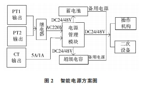 2.6智能電源環(huán)網(wǎng)柜的操作組織、操控器、通訊終端等二次設(shè)備都需求完畢不連續(xù)供電。為了行進(jìn)供電的可靠性,請(qǐng)求在供電電源失電時(shí),二次回路仍然會(huì)有電源,能夠持續(xù)可靠的動(dòng)作,環(huán)網(wǎng)柜中有必要具有備用電源。為了行進(jìn)供電電源的可靠性本電源的規(guī)劃首要選用了如下辦法:(1)環(huán)網(wǎng)柜普通選用雙進(jìn)線,兩條進(jìn)線互為備用給電源的充電模塊供電,當(dāng)其中一條進(jìn)線失電時(shí),由繼電器將另一條進(jìn)線的220V電源轉(zhuǎn)給充電模塊,保證整個(gè)柜子的二次回路持續(xù)供電。(2)當(dāng)環(huán)網(wǎng)柜的兩條進(jìn)線都失電的時(shí)分,為了使二次回路持續(xù)帶電,需求由備用電源持續(xù)供電。如今首要的備用電源是不連續(xù)電源(UPS)和蓄電池,還有的選用超級(jí)電容供電。為了行進(jìn)供電的可靠性,本電源方案選用蓄電池與超極電容相分離,兩種電源可互為備用,能夠進(jìn)一步行進(jìn)供電的可靠性。智能電源的方案如圖2所示。
